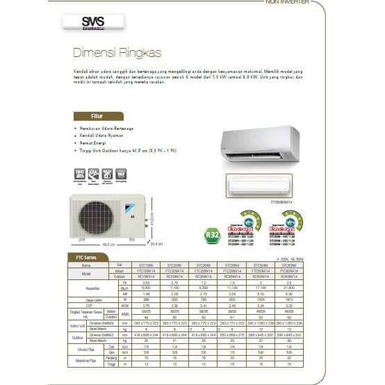 Deskripsi AC DAIKIN FTC 25 NV 1 PK standart thailand + pemasanganHarga tercantum unit only , Paket pasang ada di deskripsi iklan pilih paket A / paket B ..Speksifikasi Produk:- 1 pk- R 32- Putih_ Thailand- Daya Listrik 780 Watt- Kapasitas Dingin 9300 BTU/h- Ukuran Pipa dan Gas : 1/4 + 3/8- Dimensi indoor (H X W X D) : 28 X 77 X 22 Cm. Berat : 8 Kg- Dimensi outdoor (H X W X D) : 42 X 70 X 25 Cm. Berat : 25 Kg- Garansi 1 Tahun Sparepart dan 3 Tahun Kompressor
